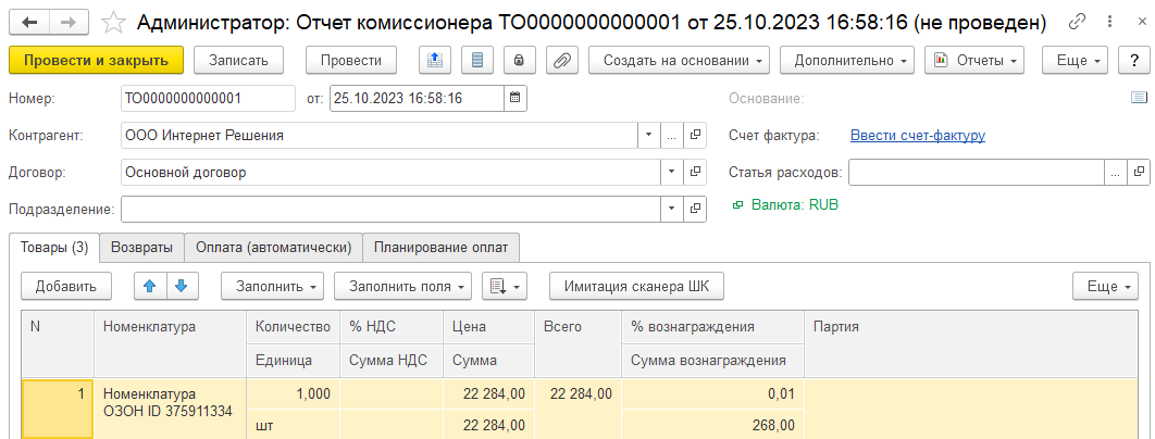 Документ «Отчет комиссионера» о продаже товаров в OZON создается регламентным заданием «OZON: Получение отчета о реализации Ozon». Отчет формируется раз в месяц не позднее 5-го числа.