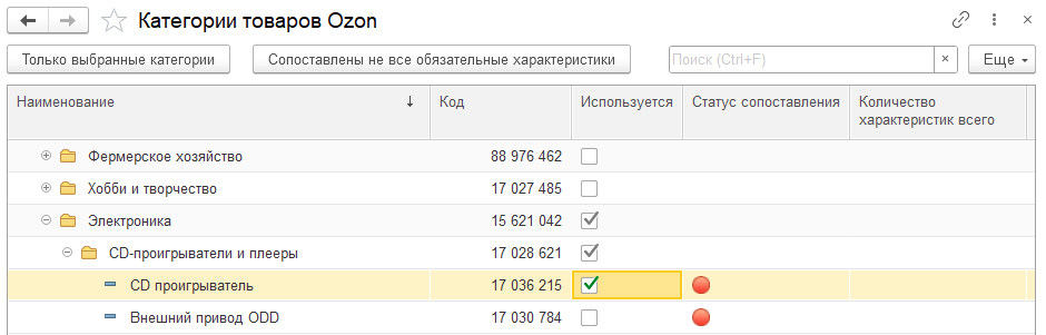После загрузки категорий в справочнике «Категории товаров OZON» следует поставить флаг «Используется» для тех категорий товаров, которые будут продаваться на OZON.