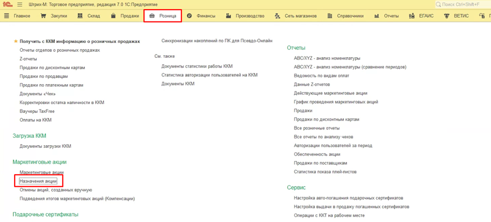 Документы "Назначение акции" создаются, хранятся и редактируются из формы списка документов "Назначение акции". Список документов доступен в разделе "Розница" - группа "Маркетинговые акции".