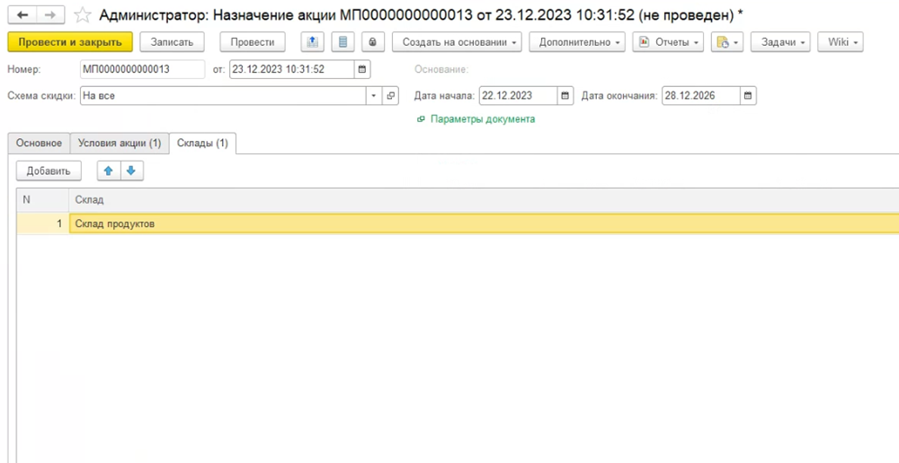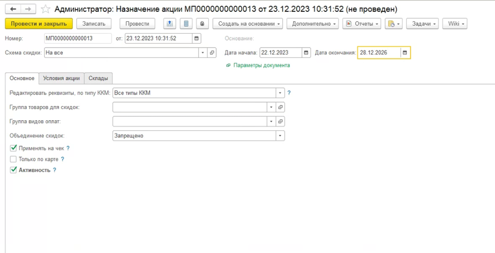 При проведении документа будут записаны параметры акции для их последующей выгрузки в кассу предприятия.