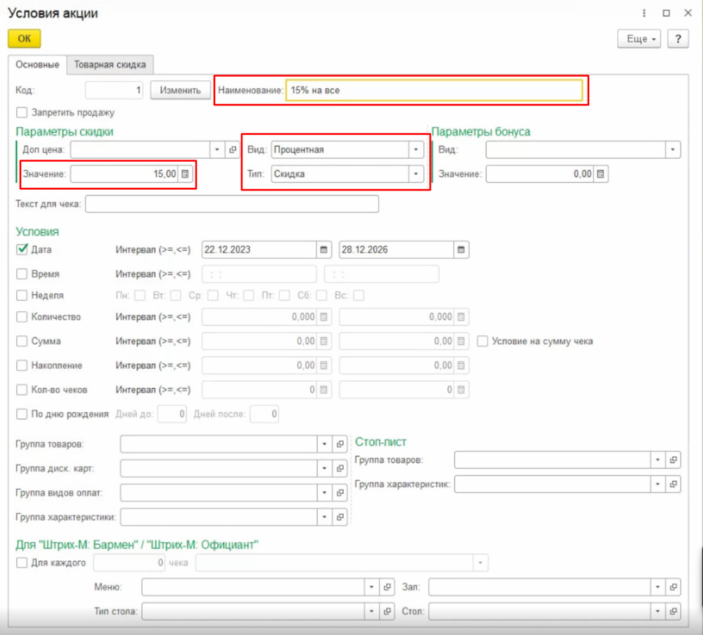 В условиях акции указываем "Наименование" и заполняем "Параметры скидки"