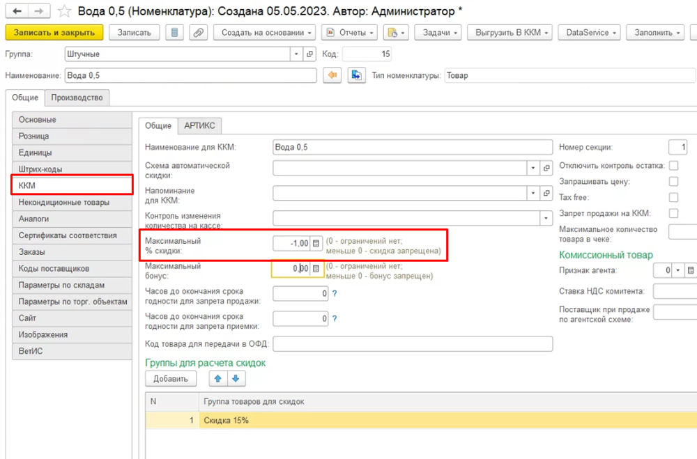 Размер скидки для товаров ограничивается в карточки товара. на вкладке "ККМ", где можем указать "Максимальный % скидки".