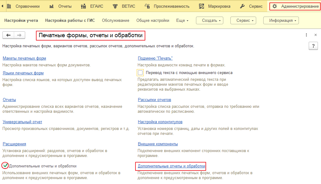 - в разделе «Администрирование» функция «Печатные формы, отчеты и обработки» установить флаг «Дополнительные отчеты и обработки».