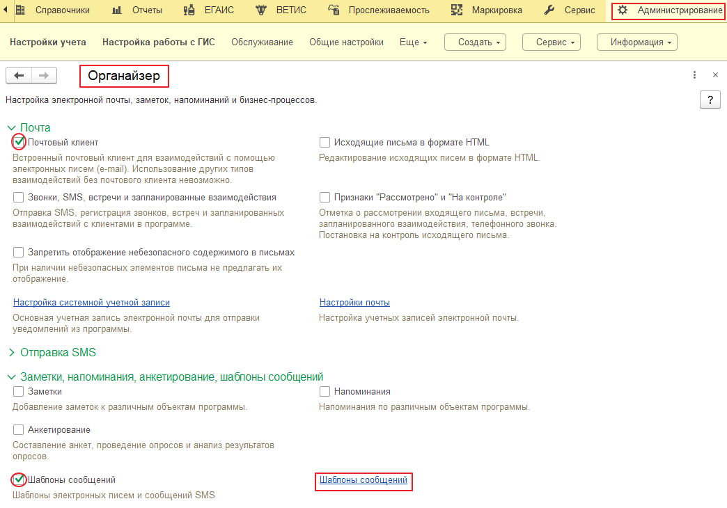 - в разделе «Администрирование» функция «Органайзер»: