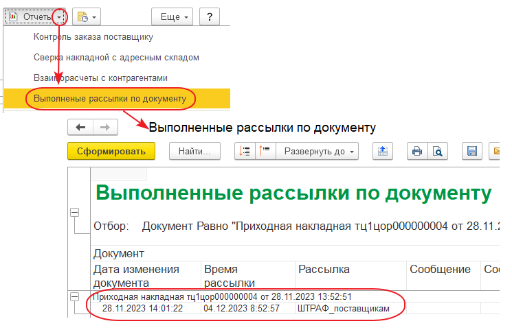 а в меню кнопки «Отчет» документов закупки/продажи будет добавлен пункт «Выполнение рассылки по документу». При выборе этого пункта открывается отчет с перечислением выполненных рассылок по данному документу.