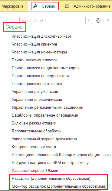 При этом в группу «Сервис» раздела «Сервис будут добавлены команды «Рассылки (дополнительными обработками)» и «Монитор рассылок (дополнительными обработками)»,