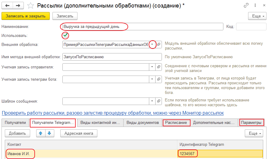 - внешнюю обработку «ПримерРассылкиТелеграмРассылкаДанныхОВыручке.epf» из каталога внешних файлов комплекта поставки добавить в справочник «Дополнительные отчеты и обработки»;