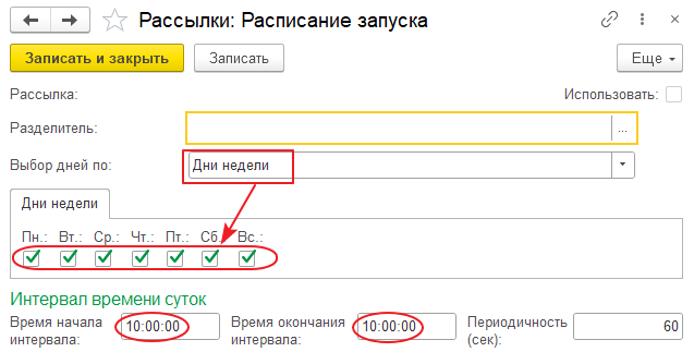 - в реквизитах «Время начала интервала» и «Время окончания интервала» надо задать одно и тоже значение — время получения рассылки. Реквизит «Периодичность» заполнится значением по умолчанию – 60 сек;
