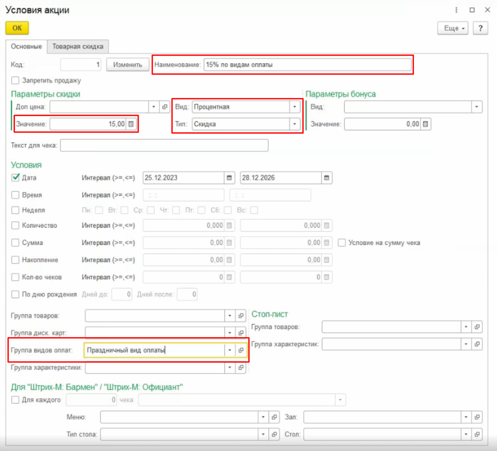 Для создания скидки по видам оплаты необходимо создать и назначить группы видов оплаты, после сформировать документ "Назначение акции" и настроить в нем "Условия акции"