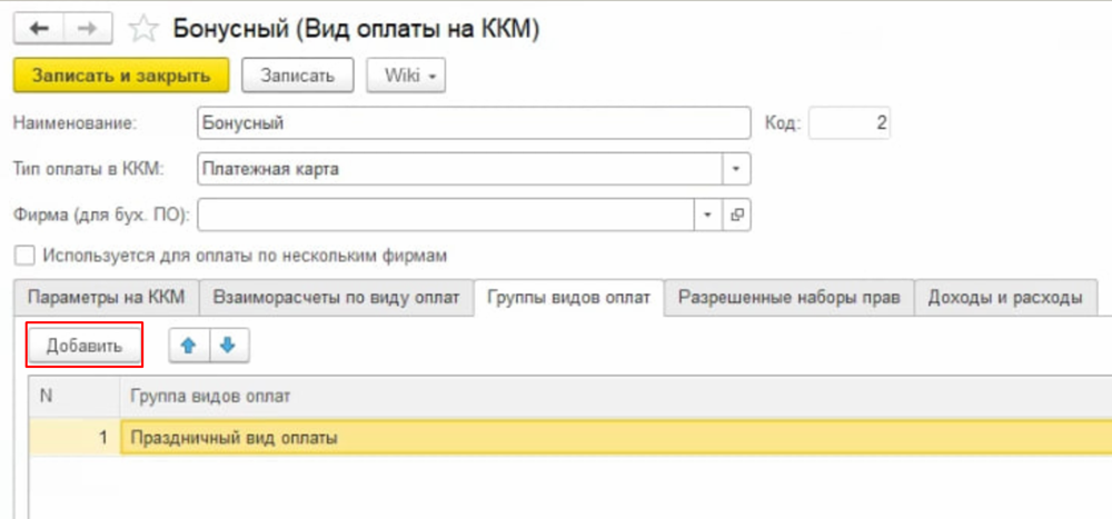 В табличной части нажимаем кнопку "Добавить", если группы видов оплат отсутствуют, то отсюда так же можно перейти в форму списка справочника "Группы видов оплат для скидок", в котором можем создать новую.
