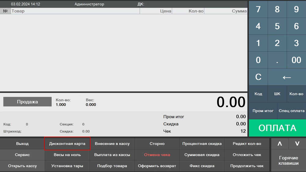 За добавление дисконтной карты отвечает кнопка "Дисконтная карта", которая вызывает форму ввода номера дисконтной карты.