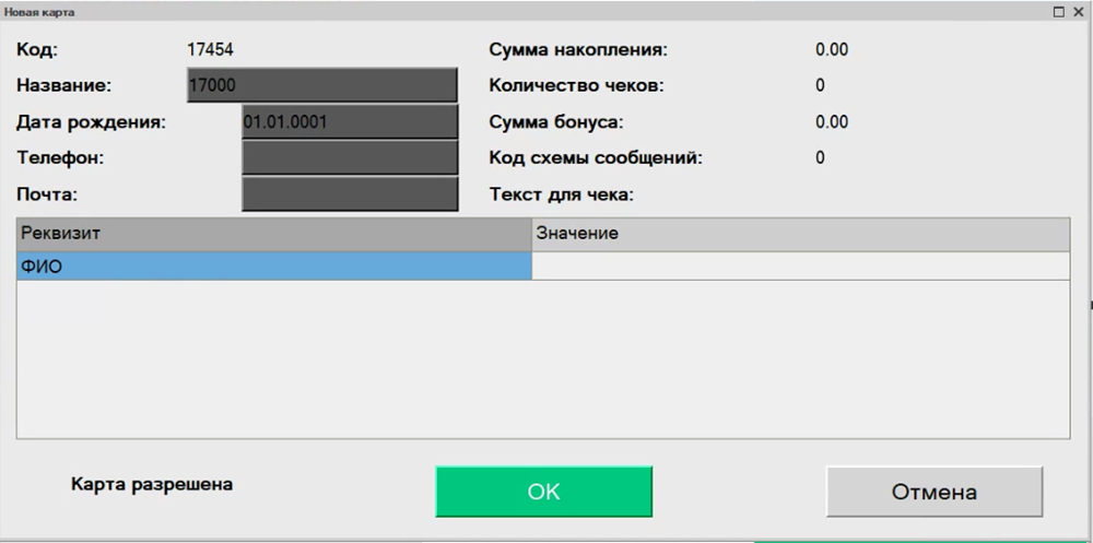 - Нажатие на кнопку с тремя точками в поле "Код" позволяет считать карту сканером