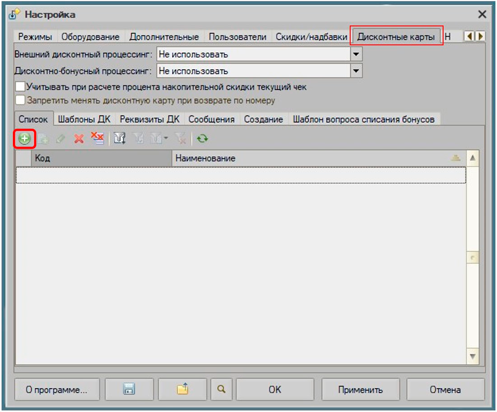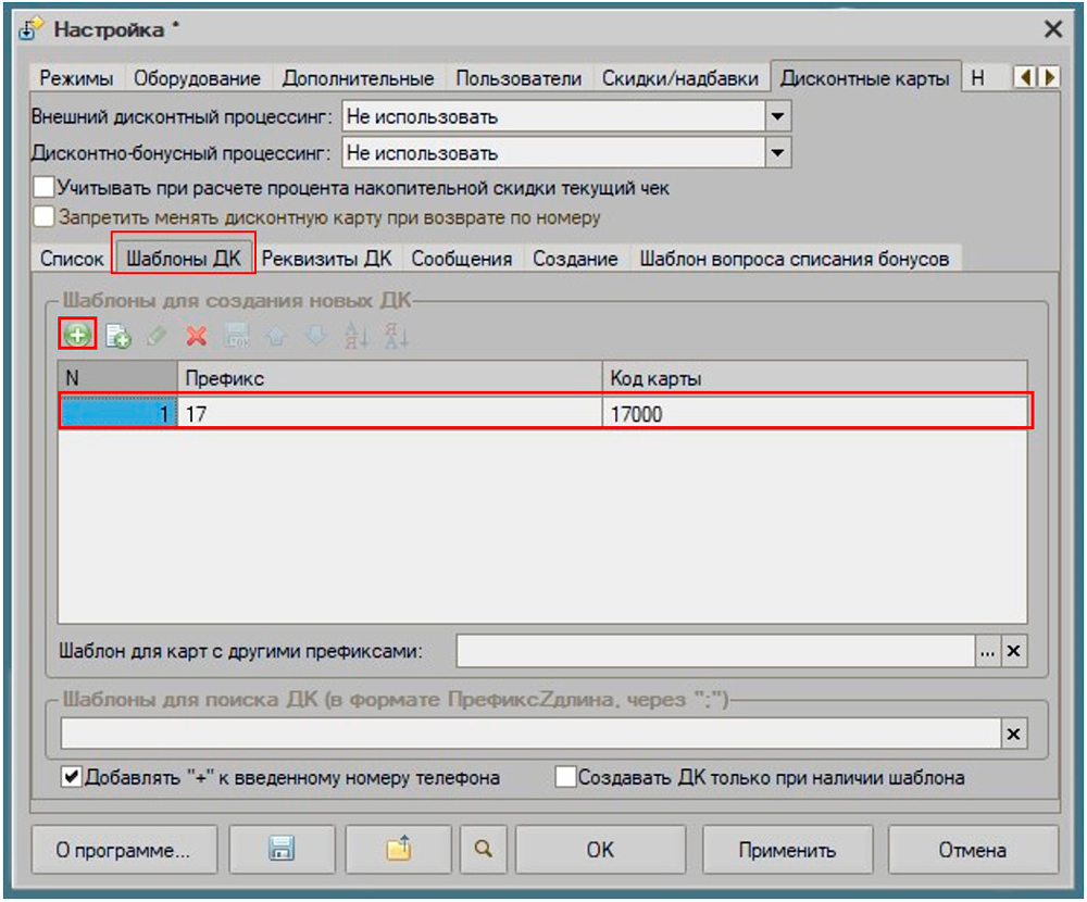 - В табличной части "Шаблоны ДК" можно добавить шаблон дисконтной карты, по параметрам которых будут создаваться новые дисконтные карты через режим регистрации, либо запрещать создание при несоответствии шаблону.