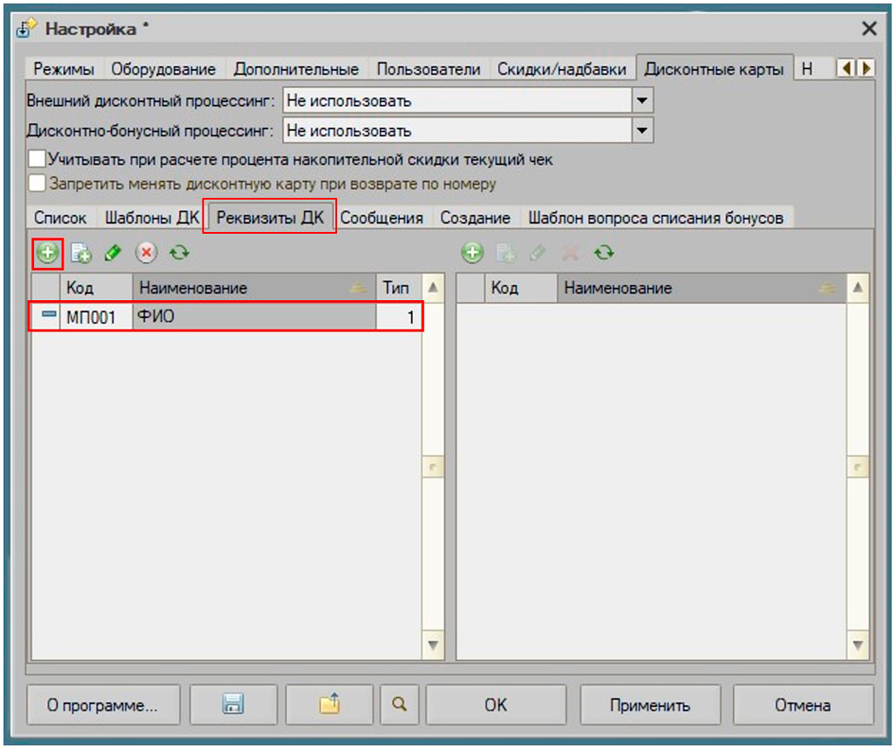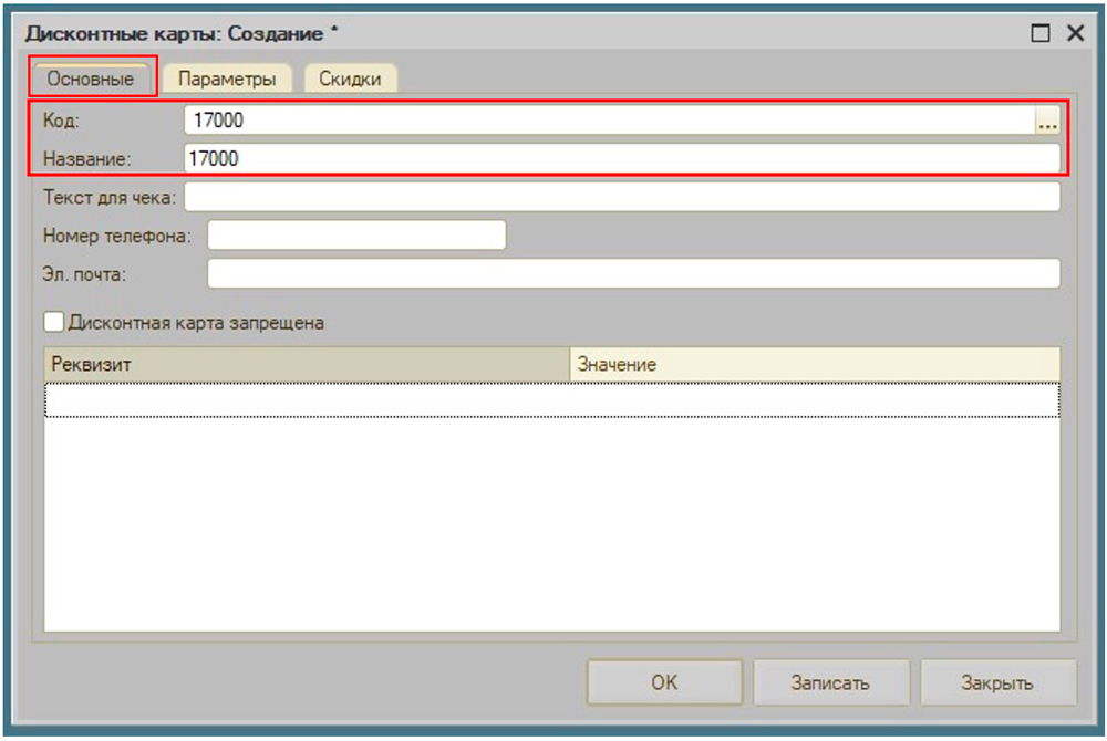 - В табличной части "Реквизиты ДК" можно добавить реквизиты дисконтной карты, которые можно указать, при создании дисконтной карты.