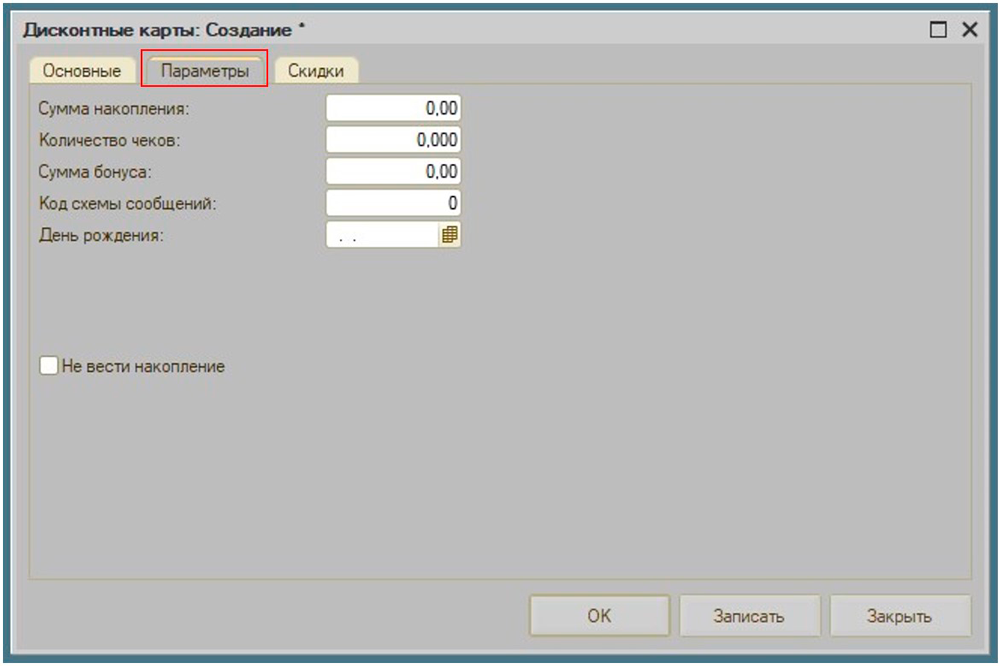 - На вкладке "Параметры" указаны данные по накоплениям, бонусам и количеству чеков, если карта новая, то указывать тут ничего не нужно.