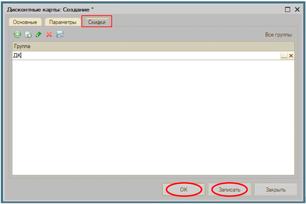 - Нажимаем "Записать" и "ОК" для сохранения и создания дисконтной карты.
