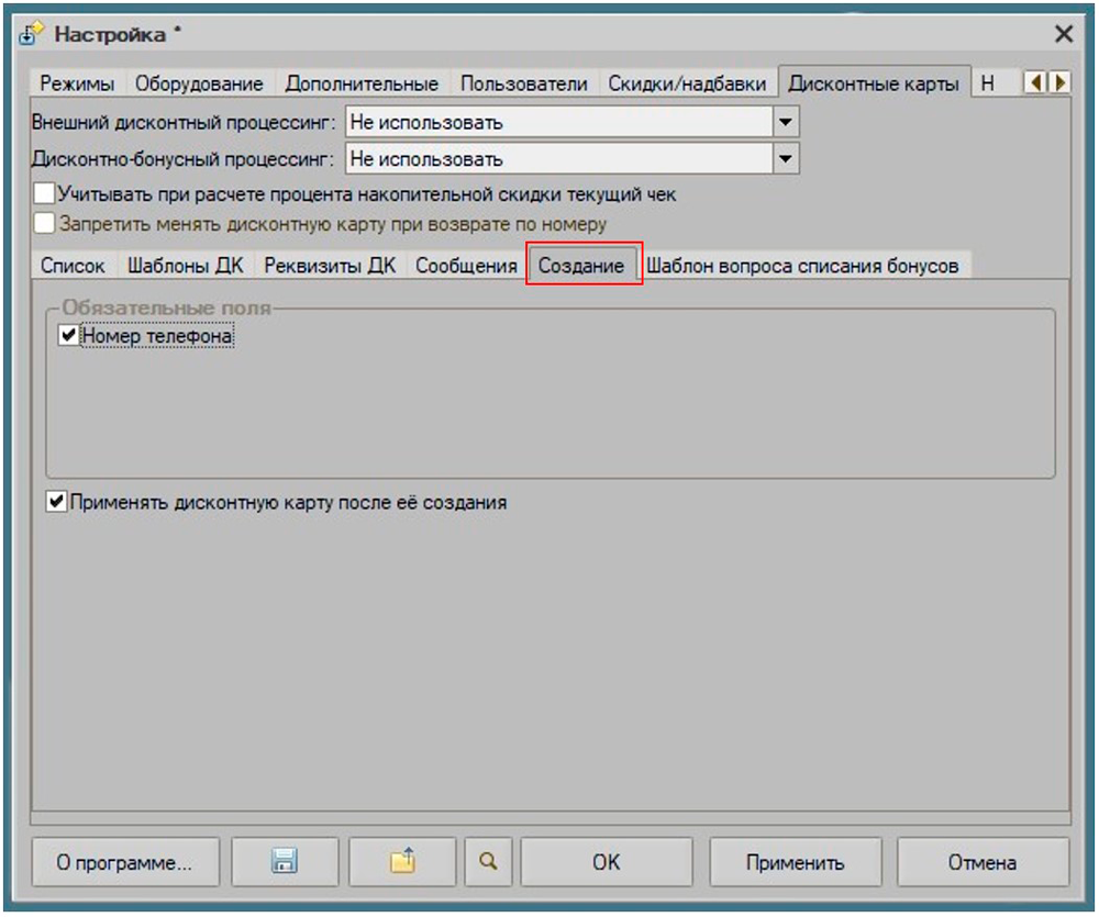 - На вкладке "Создание" две константы, является ли номер телефона обязательным реквизитом и применять ли дисконтную карту сразу после ее создания - влияет на создание дисконтной карты в режиме регистрации.