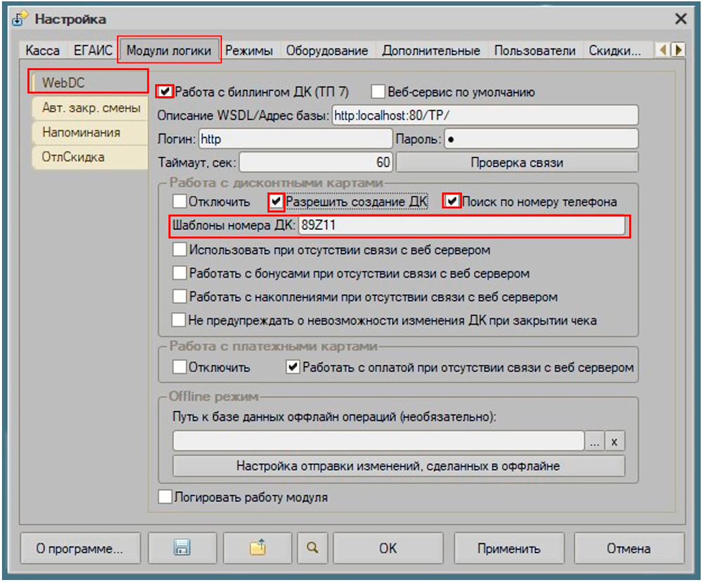 В настройках можно включить работу в режиме офлайн, когда доступа к серверу нет, в таком случае Кассир 5 использует свой справочник дисконтных карт, поэтому при таком режиме работы важно держать справочник в Кассире 5 актуальным и как минимум раз в день выгружать справочник дисконтных карт из Торгового предприятия 7.