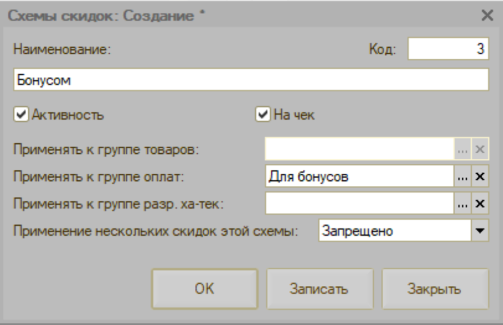 Для этого в схеме скидки, отвечающую за начисление бонусов добавляем или создаем группу видов оплат для скидок
