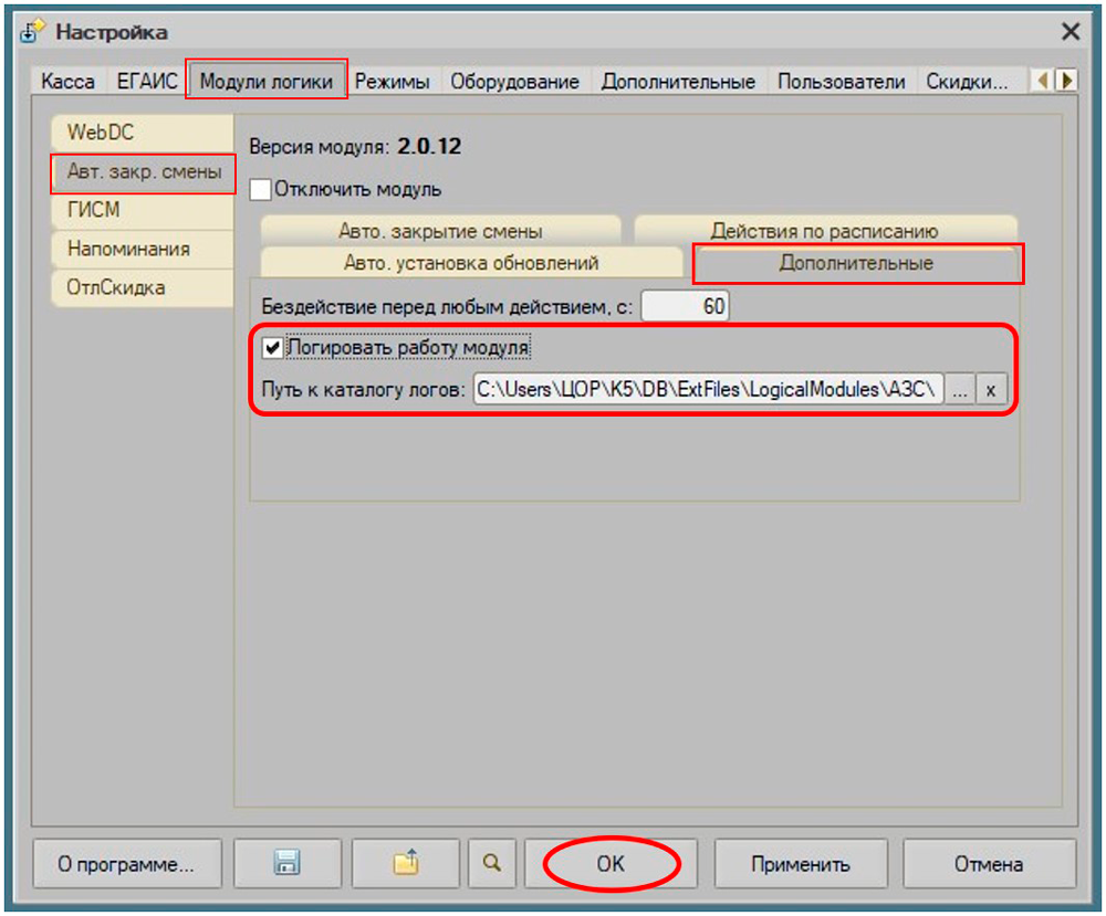 Для снятия логов при автозакрытии смены в Кассир 5 открываем "Настройки" - "Модули логики" - "Авт. закр. смены"