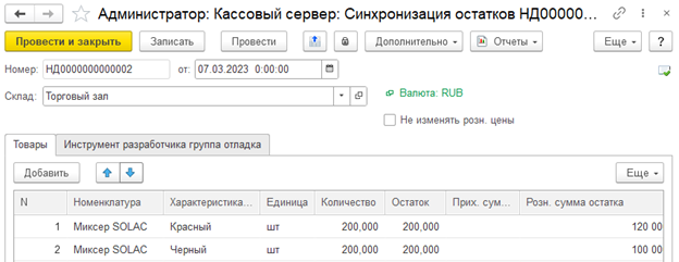 При проведении документа «Кассовый сервер: Синхронизация остатков» приходные цены записываются в партию номенклатуры и выполняется выгрузка данных в ККМ с учетом ограничений описанных ниже.