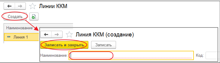 Справочник «Линии ККМ» предназначен для объединения нескольких ККМ в одну логическую единицу. В элементе справочника хранится наименование элемента справочника. Привязка ККМ к конкретному элементу справочника осуществляется в реквизите «Линия ККМ» справочнике «ККМ». Таким образом конкретная ККМ может быть привязана только к одному элементу справочника.