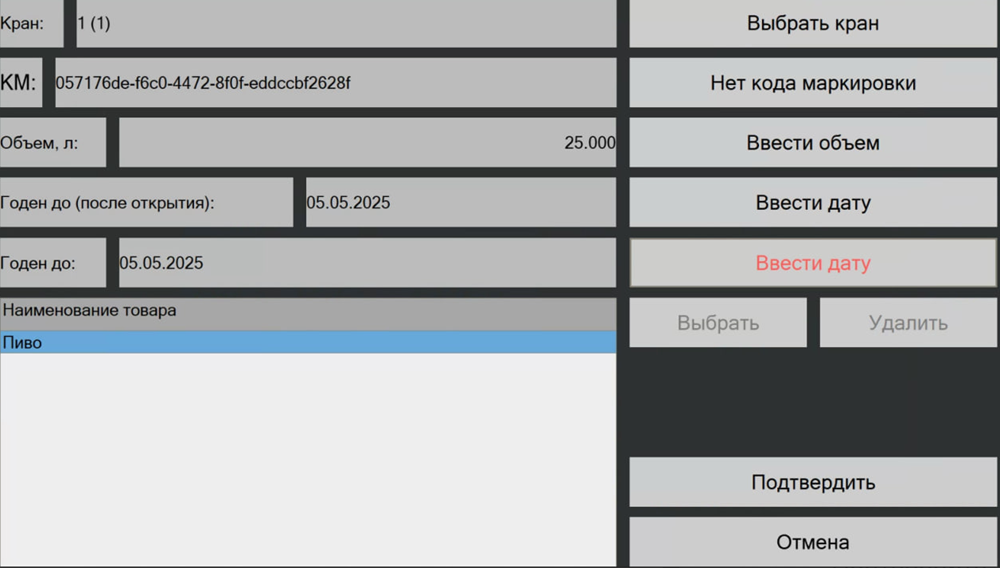 Реквизиты "Объем", "Годен до", "Годен до (после открытия)" подтягиваются из базы контроля КМ по кранам.