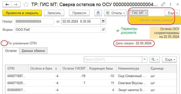 - «Остаток ГИС МТ» — количество остатка по товару с GTIN строки по данным в ГИС МТ;