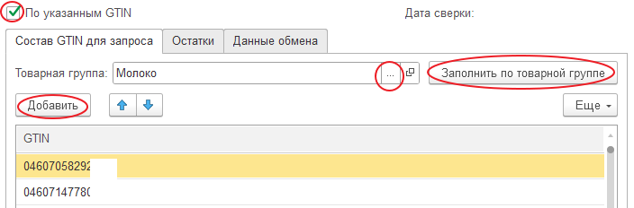Если флаг «По указанным GTIN» задан, то запрос выполняется по GTIN, указанным в закладке «Состав GTIN для запроса».