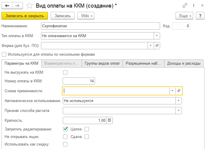 Создание вида оплат «Сертификат»