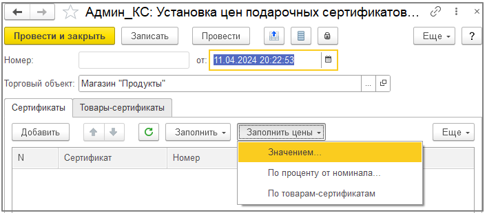 На закладке «Товары-сертификаты» нужно выбрать товар-сертификат, задать цену для него и провести документ.