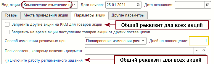 - Документы для начала и завершения акции создаются автоматически, по регламентному заданию «Маркетинговые акции: выполнение распоряжений» (в предыдущих релизах использовалось регламентное задание «Создание документов по акции»).