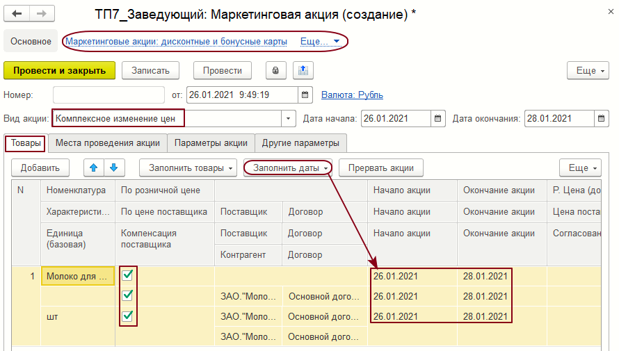 - «Дату начала изменение розничной цены» — из шапки документа реквизит «Дата начала» подставляется в графу «Начало акции» строки с маркетинговой акцией «Изменение розничных цен» (в строке установлен флаг «По розничной цене»), если у неё эта графа не заполнена; * «Дату начала изменение цены поставщика» — то же для акции «Изменение цен поставщика» (в строке установлен флаг «По цене поставщика»);