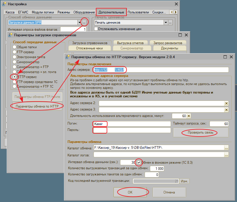 Для активации механизма необходимо настроить работу с НТТР-сервис KKMTransfer, создать пользователя для обмена данными с «Кассир 5» и задать в кассовом сервере константу «Синхронизировать остатки на кассах через HTTP-сервис» («Администрирование» → «Параметры работы с оборудованием» → вкладка «ККМ» →закладка «Настройка обмена с ККМ» →группа «Параметры НТТР-Сервис»). У элементов справочнике «ККМ» для реквизита «Способ обмена данными» должно быть установлено значение «Обмен через НТТР-сервис».