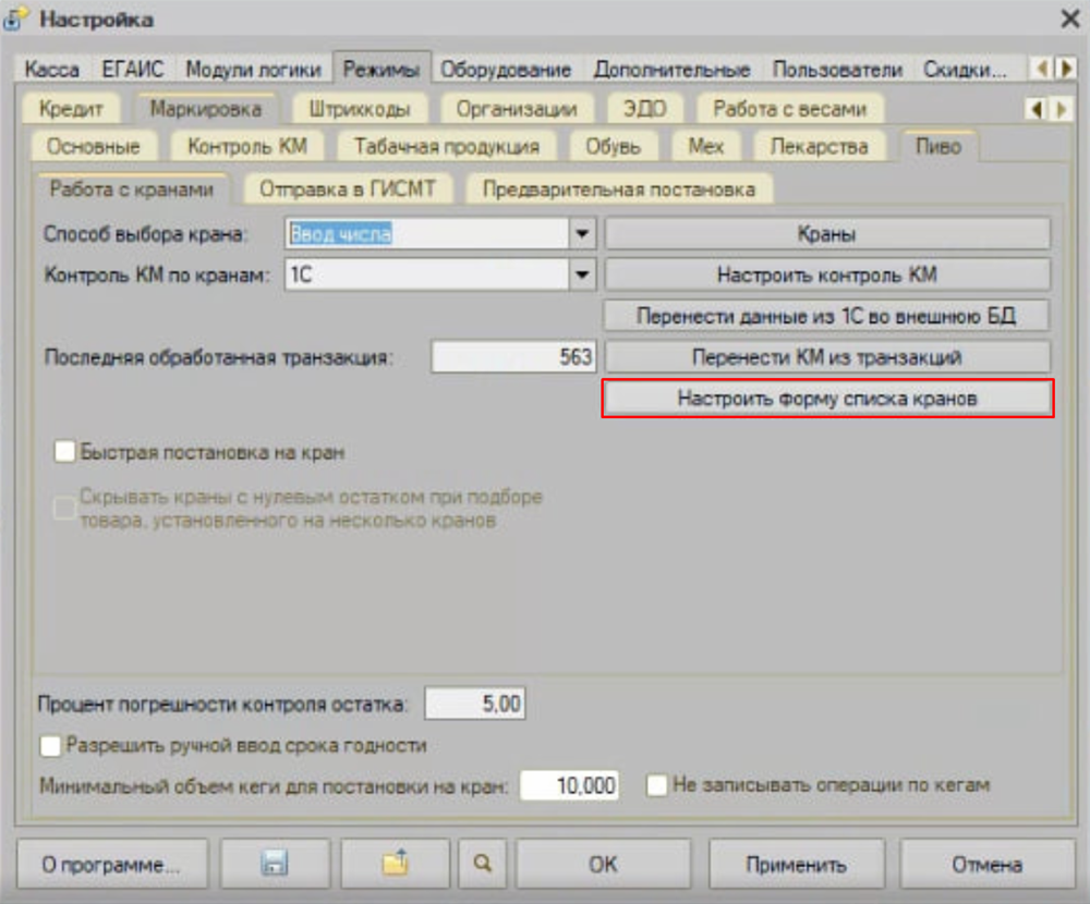 Для ее настройки переходим на вкладку "Режимы" - "Маркировка" - "Пиво" - "Работа с кранами" и нажимаем на кнопку "Настроить форму списка кранов"