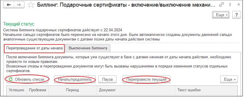 Закладка «Перепроведение от даты начала» формы «Биллнг: Подарочные сертификаты» приобретает следующий вид: