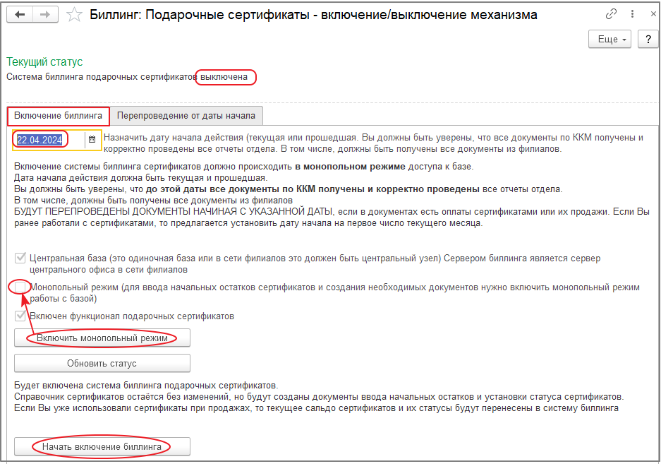 Для включения монопольного режима доступа к базе данных следует нажать кнопку «Включить монопольный режим» — будет установлен флаг у реквизита «Монопольный режим». При наличии распределенной базы данных, биллинг следует запускать в базе центрального офиса. Биллинг по подарочным сертификатам устанавливается одновременно с биллингом по дисконтным картам. Флаги у реквизитов «Центральная база» и «Включен функционал подарочных сертификатов» устанавливаются автоматически и не могут изменяться.