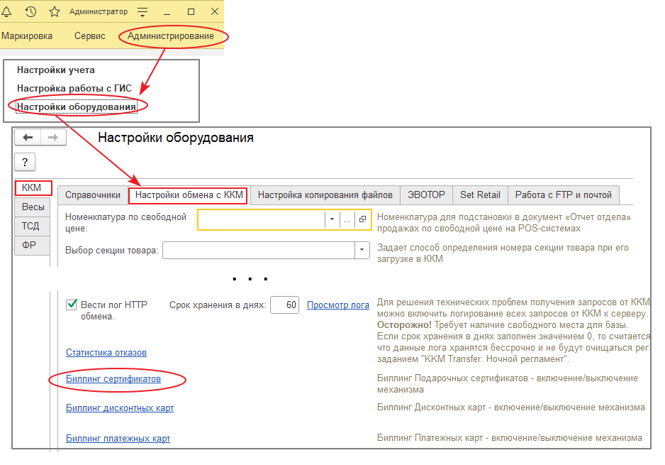 Переход на Биллинг дисконтных карт осуществляется отдельной обработкой в монопольном режиме, которая доступна в разделе «Администрирование» → «Настройки оборудования» → вкладка «ККМ» → закладка «Настройки обмена с ККМ» → в середине формы ссылка «Биллинг сертификатов».