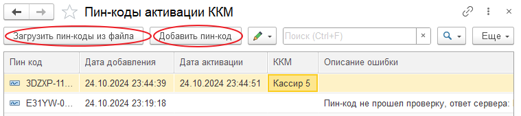 Для хранения пин-кодов и истории их использования в конфигурации используется регистр сведений «Пин-коды активации ККМ». Для просмотра данных о имеющихся пин-кодах в базе и действий с данными пин-кодами используется форма с аналогичным названием, которая доступна по ссылке «Пин-коды» в разделе «Сервис» группа «Обновление кассового ПО».