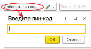 При нажатии кнопки «Добавить пин-код» открывается окно для ввода пин-кода, в котором следует ввести пин-код активации ККМ. По введенному пин-коду отсылается запрос на проверку и, если сервер не вернул ошибку, то данный пин-код добавляется в регистр сведений и на форму «Пин-коды активации ККМ».