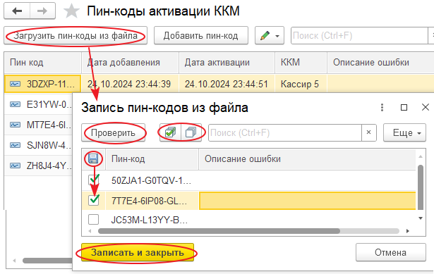 Для пин-кодов с установленным флагом ««Записать пин-код» можно, нажатием кнопки «Проверить», выполнить проверку. В строке пин-кодов, которые не прошли проверку в колонке «Описание ошибки» выводится описание ошибки, флаг добавления с таких строк снимается и эти строки подсвечиваются.