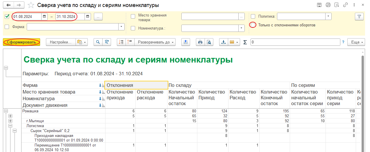 Отчет «Сверка учета по складу и сериям номенклатуры» показывает документы с движениями номенклатуры с сериями. Это позволяет посмотреть какой приход-расход номенклатуры за указанный период был по складу и по сериям номенклатуры, и есть ли отклонения по приходу и расходу.
