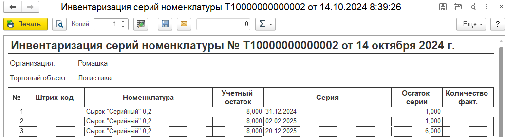 В документ «Инвентаризация по сериям» включена печатная форма для пересчета серий.