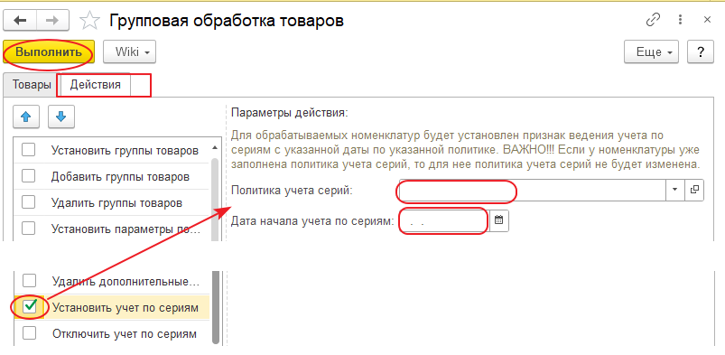 - в табличной части «Параметры действий» в реквизите «Политика учета серий» выбрать нужный элемент справочника «Политики серийного учета», а в реквизите «Дата начала учета серий» указать дату, начиная с которой учет этой номенклатуры будет вестись в разрезе по сериям;