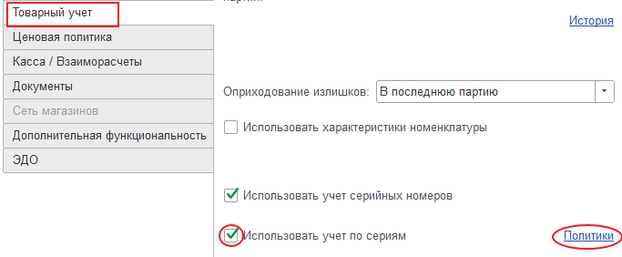 Ссылка «Политики» открывает справочник «Политики серийного учета», в котором определяется: