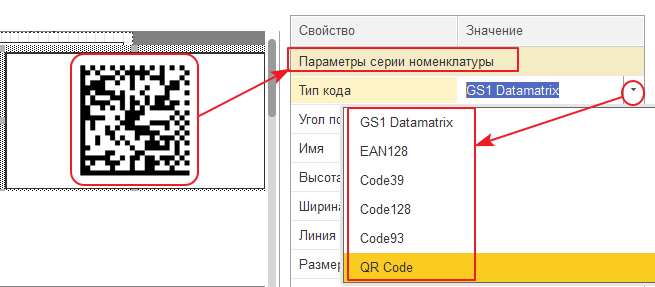 У картинки есть возможность выбора типа кода – линейный или Datamatrix/