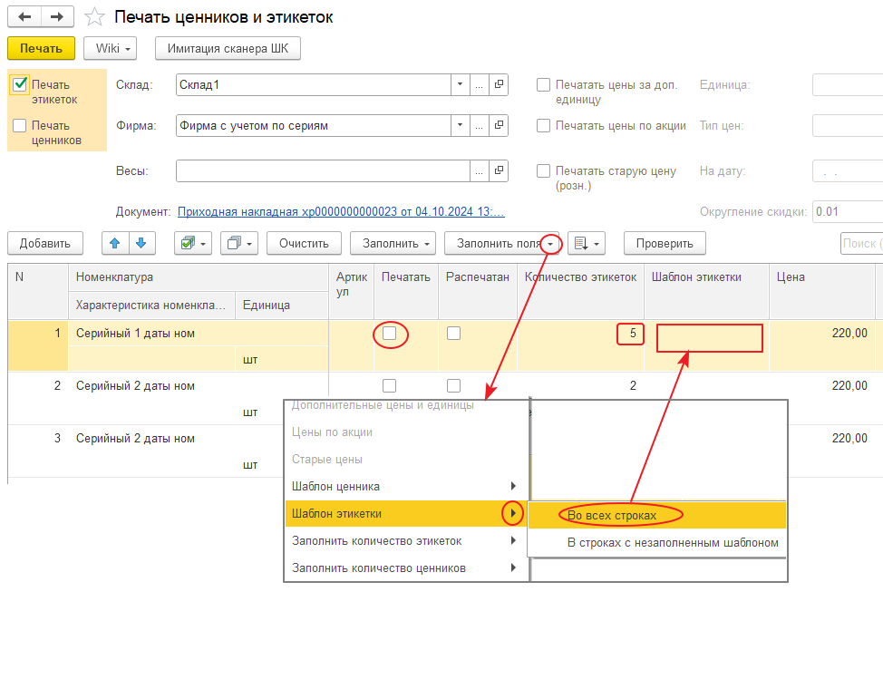 - заполнить шаблон этикетки — «Заполнить поля» → «Шаблон этикетки» → «Во всех строках» → в справочнике «Шаблоны ценников и этикеток» следует выбрать/создать нужный шаблон серии номенклатуры;