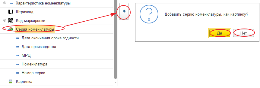Шаблон этикетки с серией номенклатуры создается в справочнике «Шаблоны ценников и этикеток» («Справочники» → «Все справочники по номенклатуре» → группа «Шаблоны» → «Шаблоны этикеток и ценников», либо вызывается из обработки «Печать ценников и этикеток»). В таблицу «Доступные поля» справочника «Шаблоны ценников и этикеток» добавлена возможность вывода реквизитов группы «Серии номенклатуры». Группу «Серии номенклатуры» можно вывести как картинку или как текст. При добавлении реквизита в шаблон задается типовой вопрос «Добавить серию как картинку?» с вариантами «Да», «Нет». Если пользователь отвечает «Нет», то в шаблон строкой добавляется текст с наименованием серии номенклатуры. Если пользователь отвечает «Да», то добавляется картинка.