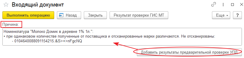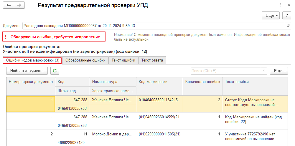 Эта же проверка позволяет посмотреть, какие коды маркировки у поставщика проблемные и как-то их обработать, что-то исправить и после этого отправить новую версию документа на проверку.
