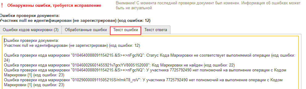Полный перечень обнаруженных ошибок, в том числе не связанных с кодами маркировки, выводится в закладке «Текст ошибки» табличной части отчета, например, «Участник не идентифицирован», «В документе нет сведений о маркированнгом товаре» и т.п..